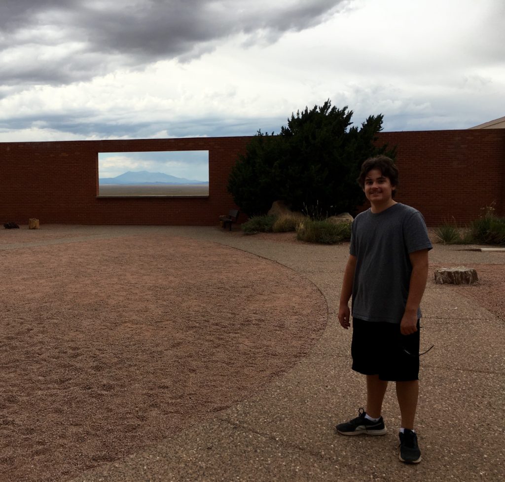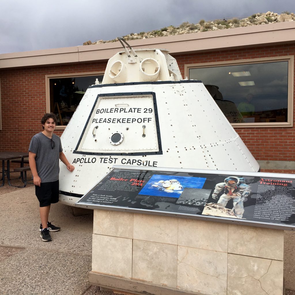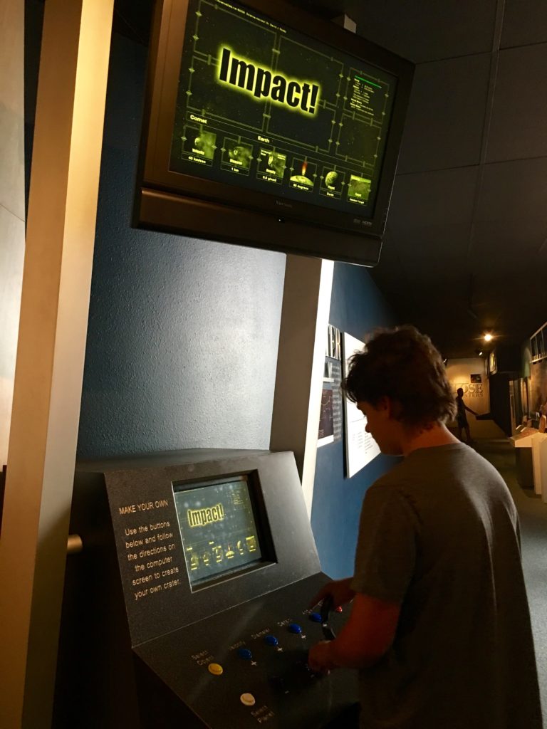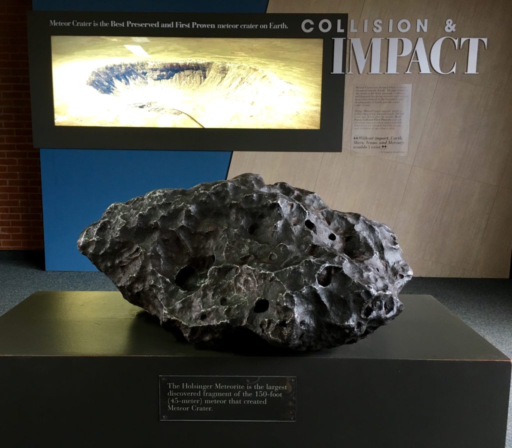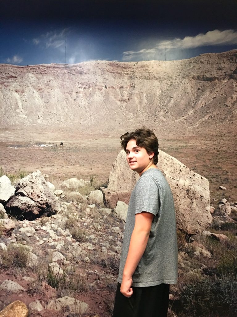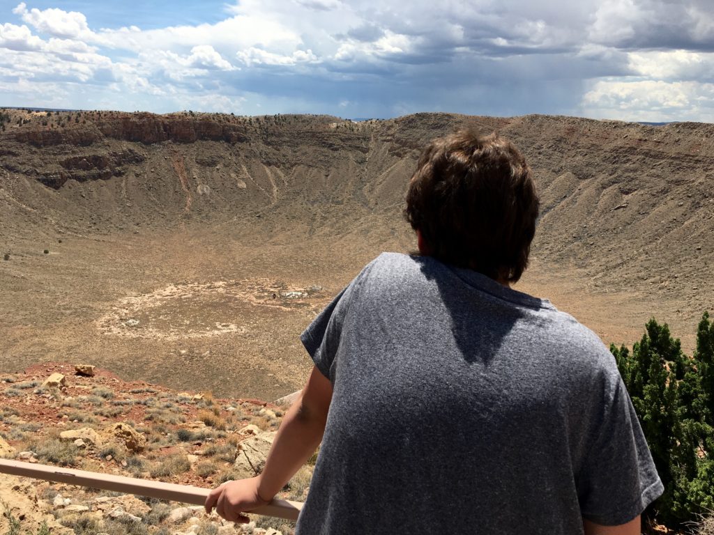 Elijah and I took a day trip back almost all the way to Winslow to go to Meteor Crater where many years ago a huge iron-nickel meteorite estimated to have been about 150 feet across and weighing several hundred thousand tons, struck the rocky plain with an explosive force greater than 20 million tons of TNT! Out of the just over 200 meteorite craters on earth, this one is the most well-preserved in the ENTIRE WORLD! Probably due to being in the desert of Arizona which has a dry climate with very little water, which makes sense as water is the biggest source of erosion. Check it out…